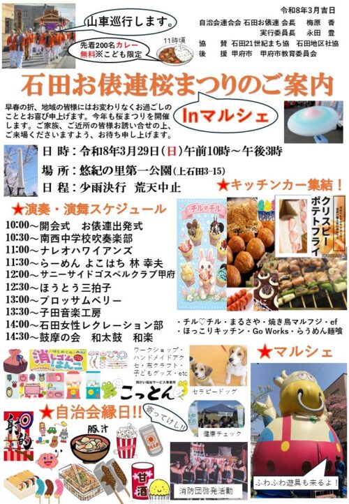 令和8年3月29日(日)10時~15時 悠紀の里第一公園(甲府市上石田3-15)にて